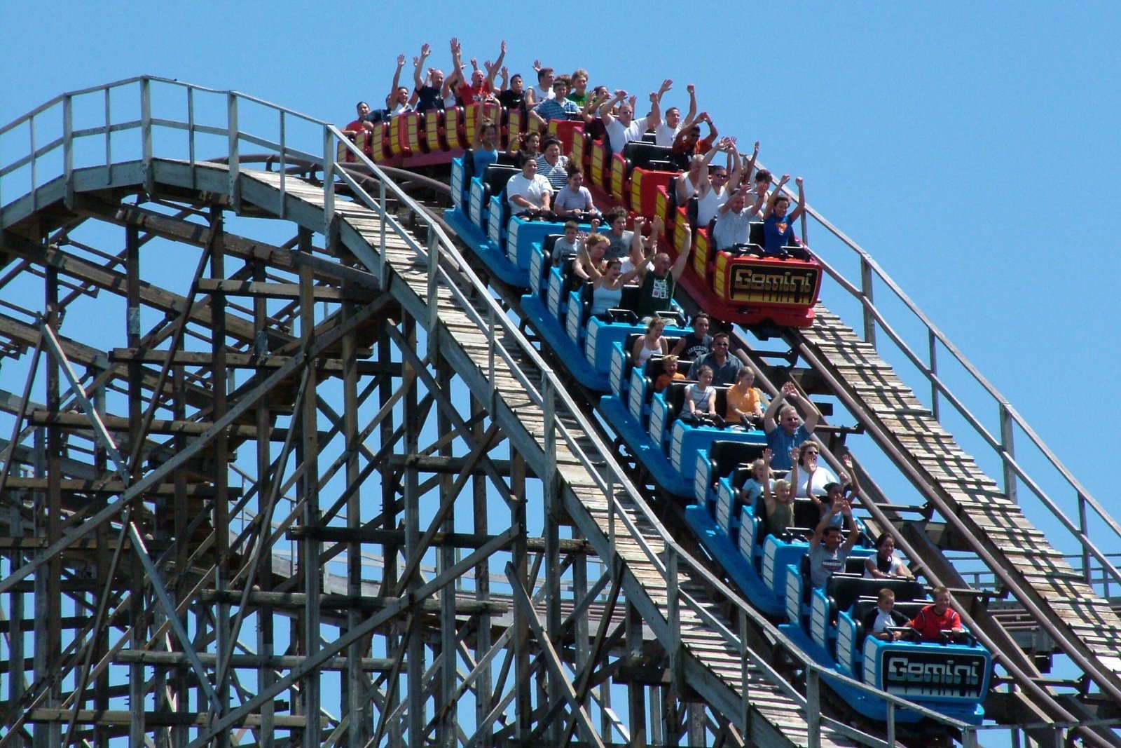 Gemini turned roller coasters into a head-to-head competition. Two trains launched side by side, daring riders to look over and see who was winning. The near misses and synchronized drops made it feel chaotic and fast. That sense of racing was new and thrilling.
