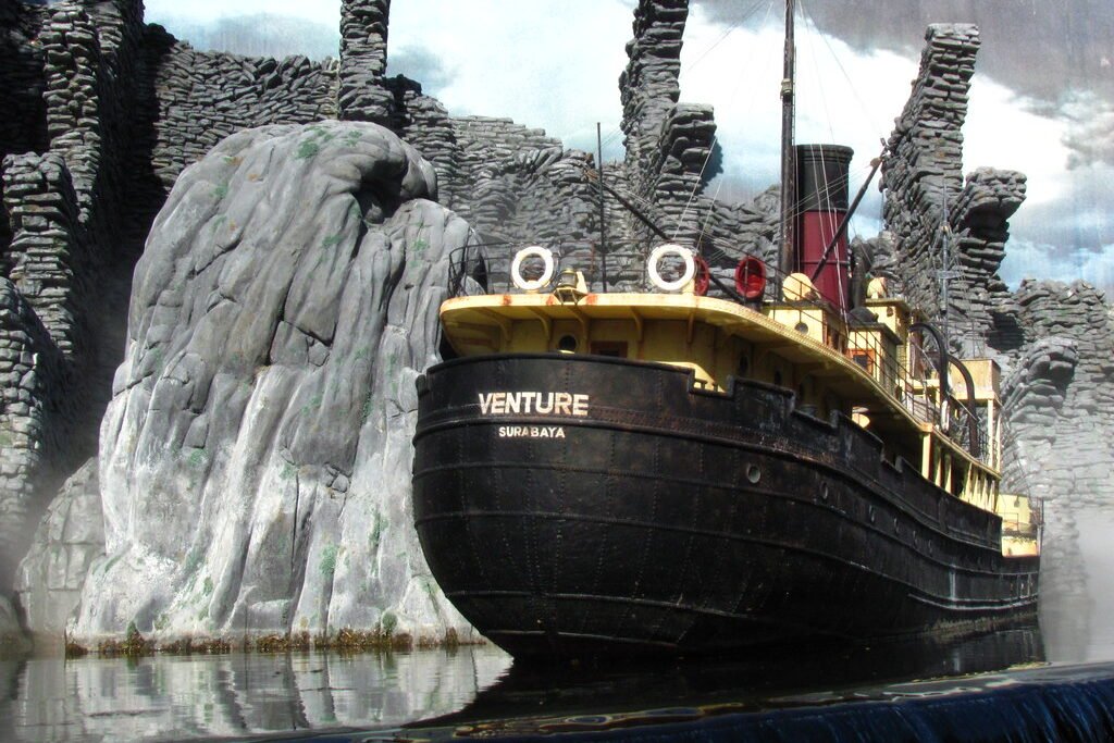 The original Jaws ride leaned heavily into suspense and fear. Guests boarded a boat thinking it would be calm, only to be stalked by a mechanical shark. At the time, animatronics of that size were rare and unsettling. The water setting made everything feel more real.